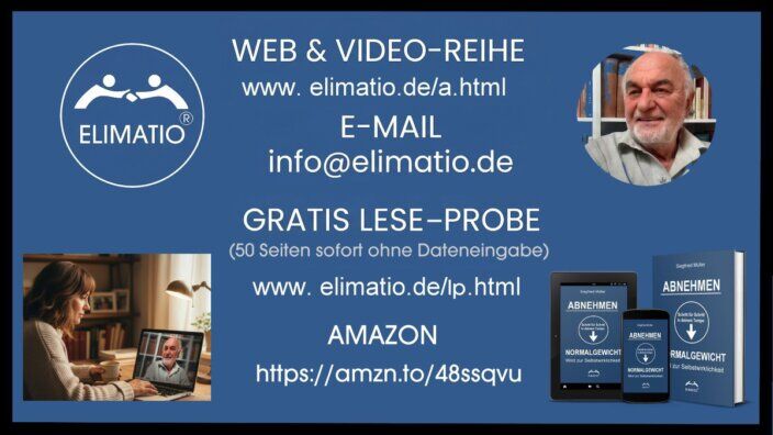 - Der Ratgeber als Reiseführer: Die Basis bildet der ELIMATIO-Ratgeber. Er vermittelt das notwendige Wissen über die physikalische Energiebilanz und die psychologischen Muster hinter dem Essverhalten.